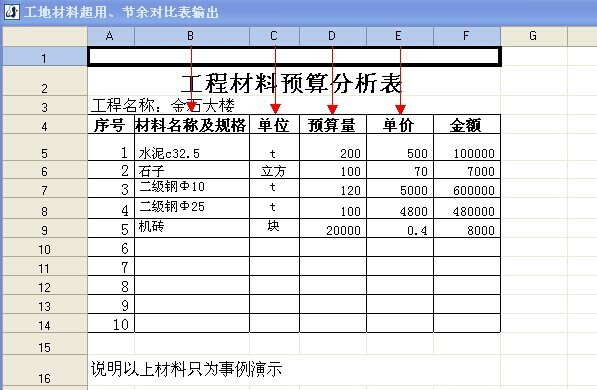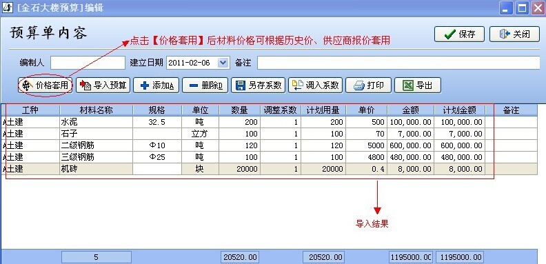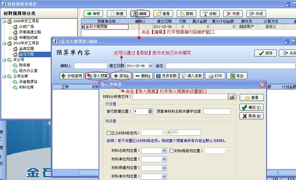 注:以上只是演示了導(dǎo)入預(yù)算的全過程,在實踐當(dāng)中還是建議用戶只將大材料用手工【添加】的方式建立預(yù)算單,因為零星的材料名稱多而且繁雜,如果也要將零星材料從預(yù)算中導(dǎo)入、再做一一對應(yīng),這樣勢必給用戶帶來很大的工作量。況且零星材料也不好準確估算出實際用量。