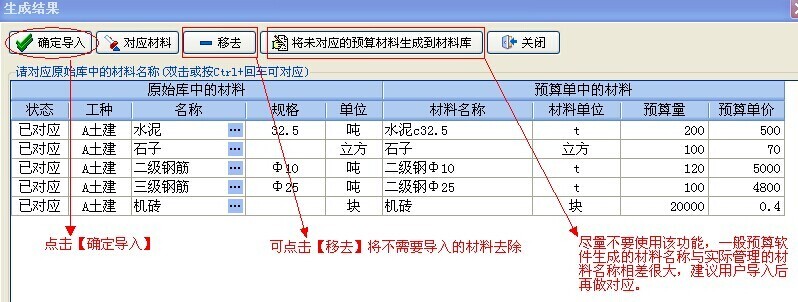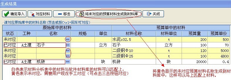 導(dǎo)入完的生成結(jié)果,(由于預(yù)算軟件中生成的材料分析表里的材料名稱與實際發(fā)生的材料名稱有些差異,這里需要用戶將未對應(yīng)的材料做下手工匹配)