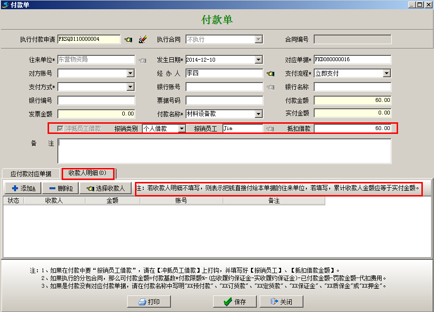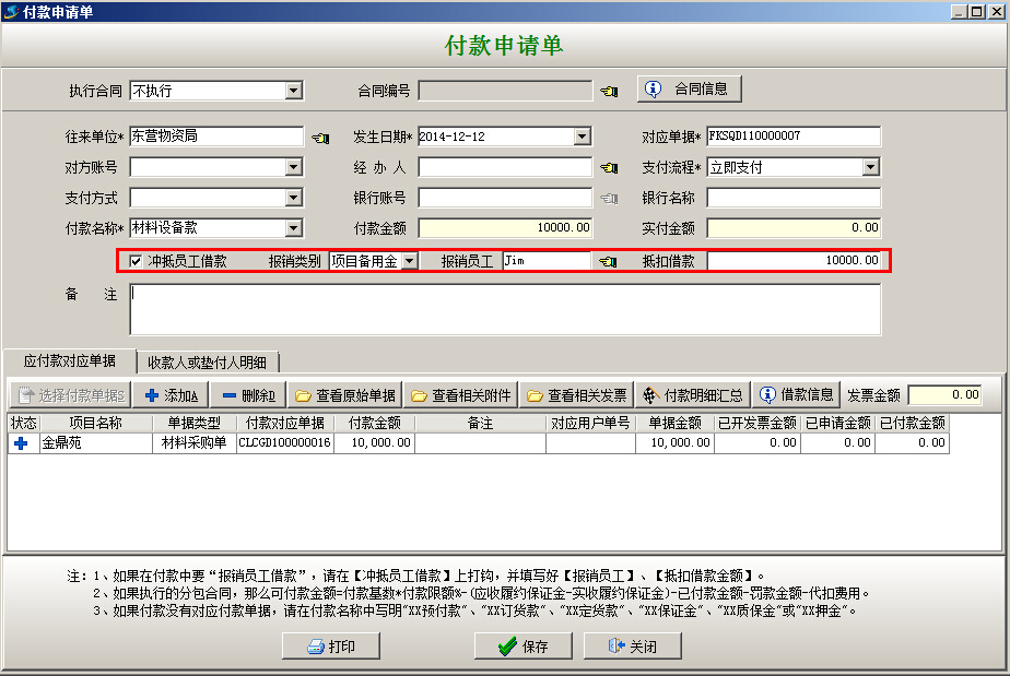 (2)本情況和(一、員工墊付)情況比較中多了前期借款步驟、后期還款步驟。中間的報(bào)銷環(huán)節(jié)基本一樣,區(qū)別在【付款申請(qǐng)單】和【付款單】中要選中“沖抵員工借款”選項(xiàng),報(bào)銷類別選擇“個(gè)人借款”,不需要填寫“收款人明細(xì)欄目”如下圖: