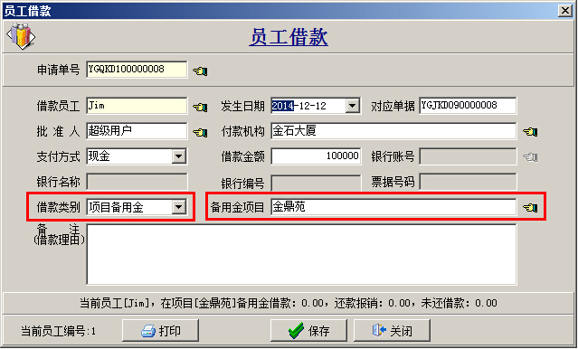 (1)本解決方案基本上和情況二類似,區(qū)別在于員工請(qǐng)款單、員工借款單的[借款類別]要為“項(xiàng)目備用金”,如下圖: