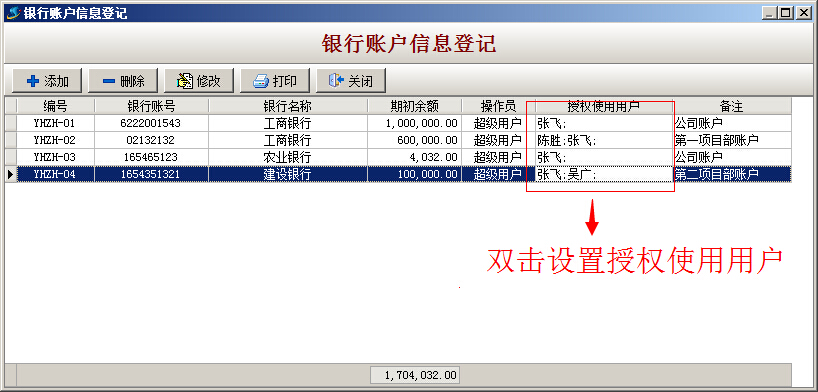 (2)讓超級(jí)用戶或總公司財(cái)務(wù)經(jīng)理在期初使用軟件時(shí),在軟件的主菜單中【財(cái)務(wù)】->【銀行管理】->【銀行賬戶信息登記】中建立總公司賬戶和項(xiàng)目部(或子公司)賬戶,其中總公司銀行賬戶的授權(quán)使用人要設(shè)置為總公司的相關(guān)財(cái)務(wù)人員和總經(jīng)理,項(xiàng)目部(或子公司)賬戶的授權(quán)使用人要設(shè)置為總公司和該項(xiàng)目部(或子公司)的相關(guān)財(cái)務(wù)人員和經(jīng)理,這樣總公司人員不但能查詢總公司的銀行資金流水還能監(jiān)控到各項(xiàng)目部的流水,項(xiàng)目部(或子公司)只能查看自己的資金流水。如下圖: