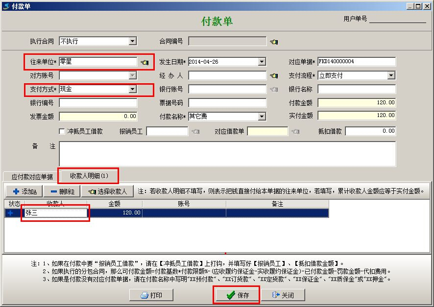 (5)因?yàn)殄X是直接給的員工,所以在做【付款申請(qǐng)單】或【付款單】時(shí),注意“收款人明細(xì)”中寫名收款為墊付的員工。往來(lái)單位要寫明真實(shí)單位,如果是不具名的單位,可以提前在基礎(chǔ)信息的【往來(lái)單位維護(hù)】中添加一個(gè)名稱為“零星”的單位,統(tǒng)一處理類似費(fèi)用的支出。如下圖: