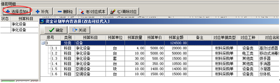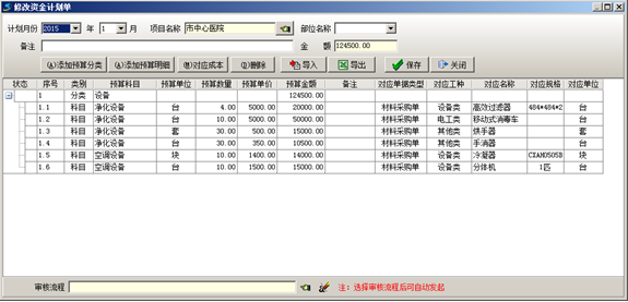 例如下圖所示:預(yù)算分類為設(shè)備,明細(xì)科目為凈化設(shè)備,對應(yīng)的名稱可以為高效過濾器、移動(dòng)式消毒車、烘手器等。