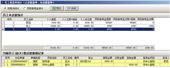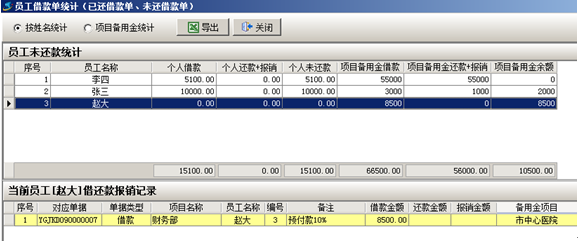 請款審核完成后,接下來是財(cái)務(wù)人員把錢支付給請款人然后執(zhí)行【員工請款單】生成【員工借款單】。下圖所示:生成【員工借款單】后在員工借款單統(tǒng)計(jì)中可以看到,目前借款人趙大,項(xiàng)目備用金借款為8500元。