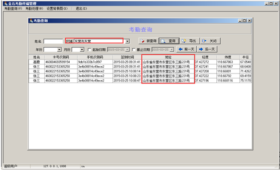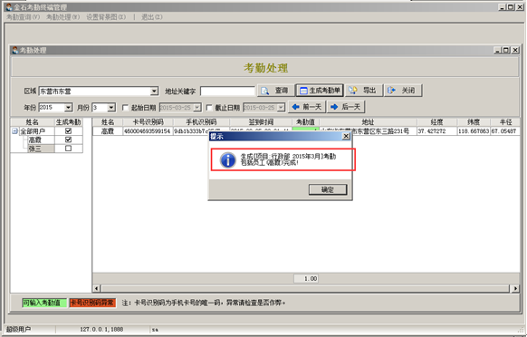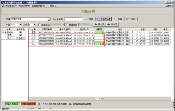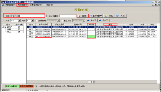 輸入“區(qū)域名稱”或者“關鍵字”,點擊“查詢”按鈕可查詢考勤信息,“卡號識別碼”是手機卡號的唯一識別碼,當“卡號識別碼”顯示異常時可檢查是否存在作弊行為,系統(tǒng)自動定位用戶的簽到地址,若簽到信息正??筛鶕?jù)簽到時間在“考勤值”輸入框中輸入對應的考勤值(若同一用戶一天內多次考勤只在最后一次輸入考勤值),如圖: