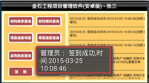這樣用戶名為test的用戶登錄系統(tǒng)進入到“手機考勤管理終端”就可以查看并處理“東營市東營區(qū)”的手機考勤的信息。項目上的工作人員在用手機客戶端簽到的時候,登錄系統(tǒng),點擊“簽到”的按鈕,簽到成功之后系統(tǒng)提示“簽到成功”并顯示簽到時間,如圖: