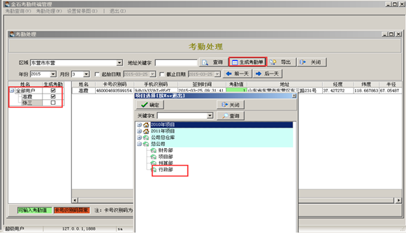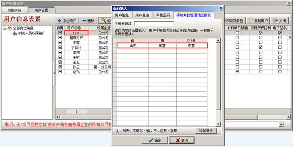 項目上的工作人員不方便到公司簽到,可在安卓手機上下載并安裝好金石軟件的手機客戶端之后登錄手機客戶端進行簽到。需要查詢并處理考勤信息的用戶在查詢信息前要先進入到“系統(tǒng)維護”-“用戶管理權限設置”里面進行“手機考勤管理地區(qū)授權”的設置,被授權的用戶就可以查看并處理被授權地區(qū)的手機考勤的信息。如圖: