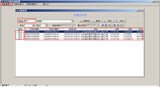手機簽到成功之后,在服務器端登錄系統(tǒng)之后,有查看權限的人可以進入“手機考勤管理終端”查看員工的簽到信息并進行管理。如需查看考勤信息可點擊“考勤查詢”的按鈕,可按照“姓名”進行查詢,或者輸入被授權的“地區(qū)名稱”進行查詢,輸入“姓名”查詢到的是對應的員工的簽到信息,輸入地區(qū)名稱查詢到的是在對應地區(qū)內簽到的所有員工的查詢信息,如圖: