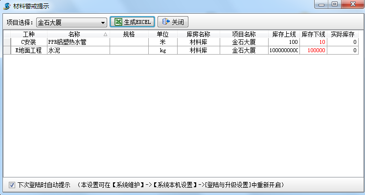 我們也可以設置登錄軟件時自動提示庫存警戒。設置好之后當材料的庫存量達到了預警設置中設置的上限或者下限,登錄時會自動彈出提示。