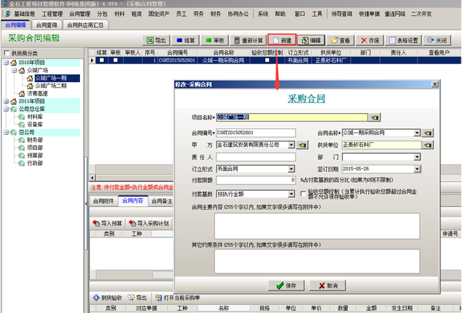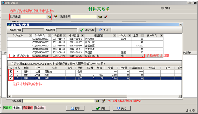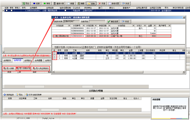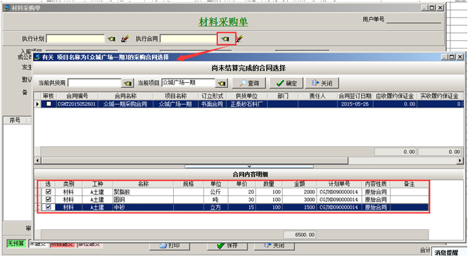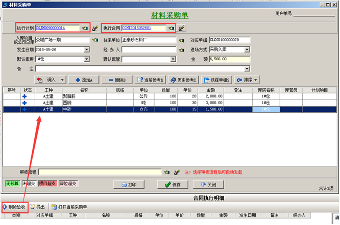第四步,材料到貨之后,可在【材料管理】模塊,做“材料采購(gòu)單”,選擇材料的時(shí)候,選擇“執(zhí)行合同”,在合同明細(xì)里面添加到貨內(nèi)容。如圖: