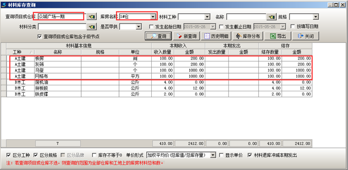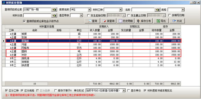 執(zhí)行完成工程項(xiàng)目材料采購(gòu)流程之后可在對(duì)應(yīng)的倉(cāng)庫(kù)中查詢(xún)到對(duì)應(yīng)的材料庫(kù)存,如圖:
