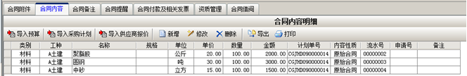 第三步,選擇完成之后會(huì)將信息調(diào)入到合同內(nèi)容明細(xì)中,如圖