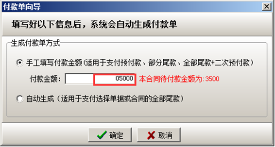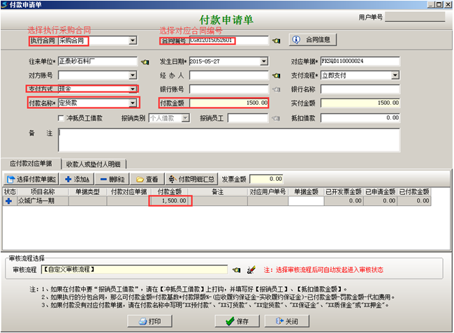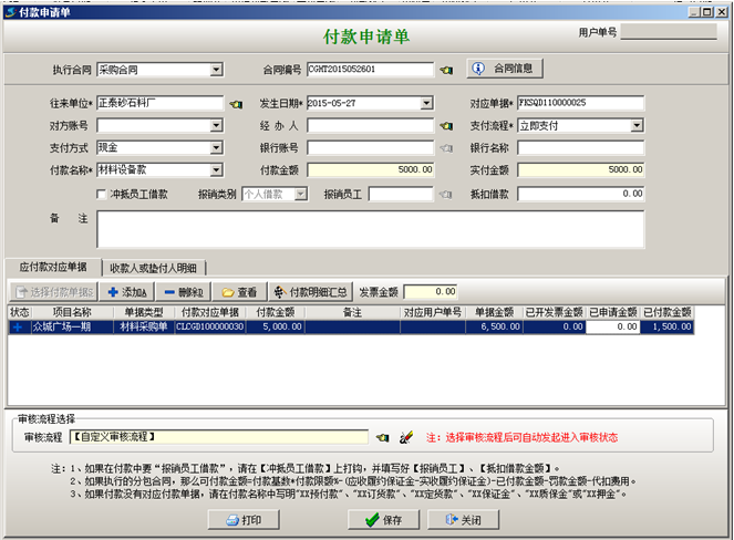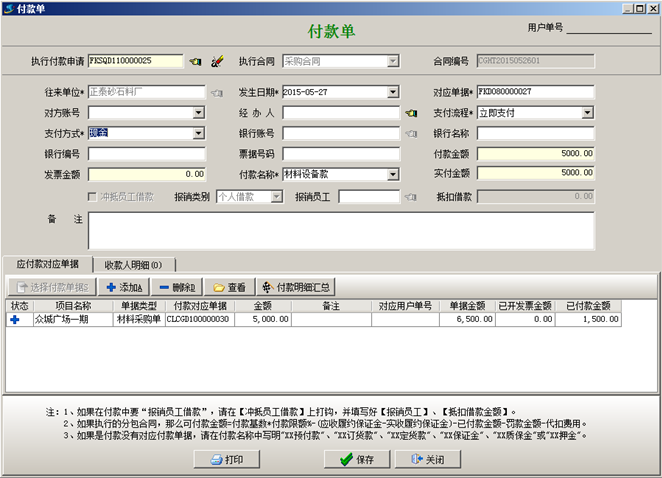 在工地現(xiàn)場(chǎng)材料管理過(guò)程中,如果工地現(xiàn)場(chǎng)采購(gòu)大量材料需要簽訂采購(gòu)合同并在到貨之前付預(yù)付款時(shí),我們要在采購(gòu)合同中,選中對(duì)應(yīng)的采購(gòu)合同,點(diǎn)擊[合同付款及相關(guān)發(fā)票],點(diǎn)擊[執(zhí)行付款]-[手工填寫(xiě)]彈出“付款申請(qǐng)單”,在“付款申請(qǐng)單”中選擇執(zhí)行“采購(gòu)合同”,并選擇對(duì)應(yīng)的“合同編號(hào)”,選擇“支付方式”,選擇“付款名稱”為“訂貨款”,并在“付款金額”里面輸入“預(yù)付款”金額,“付款申請(qǐng)單”添加完成之后點(diǎn)擊[保存]的按鈕保存單據(jù),如圖: