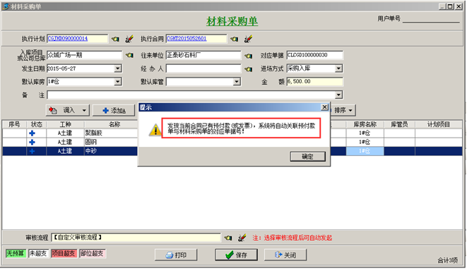 在工地現(xiàn)場(chǎng)材料管理過(guò)程中,材料到貨之后,可以做采購(gòu)入庫(kù)單(材料驗(yàn)收單)執(zhí)行驗(yàn)收入庫(kù)(或直進(jìn)項(xiàng)目)?;蛟凇昂贤瑑?nèi)容”里面,點(diǎn)擊[到貨驗(yàn)收],在彈出“采購(gòu)入庫(kù)單”(材料驗(yàn)收單),在單據(jù)中輸入“驗(yàn)收數(shù)量”,保存時(shí)系統(tǒng)會(huì)提示自動(dòng)關(guān)聯(lián)第一次預(yù)付款,“確定”之后保存,如圖: