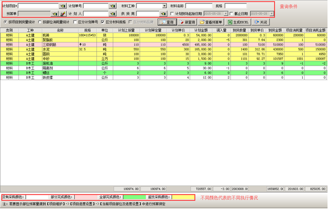如果要查看材料采購(gòu)的執(zhí)行情況,可進(jìn)入到[采購(gòu)計(jì)劃執(zhí)行查詢]里面按照查詢條件進(jìn)行查詢??筛鶕?jù)材料顯示的不同的顏色看出材料的采購(gòu)計(jì)劃執(zhí)行情況,如圖: