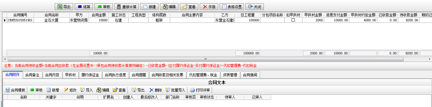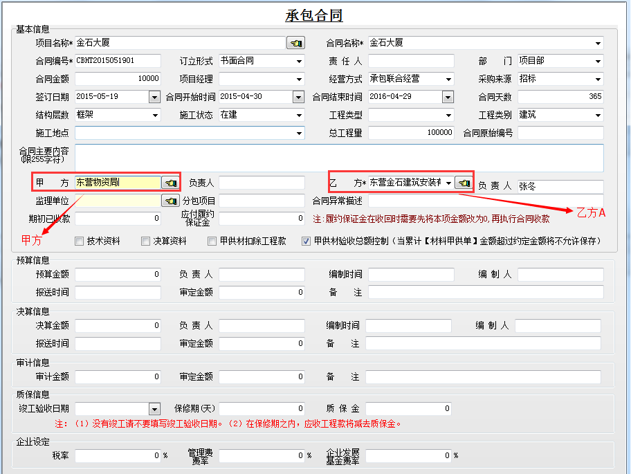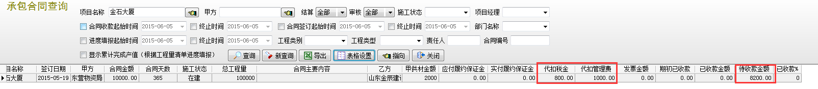 在工程項目資質(zhì)掛靠管理中因為借用乙方B的資質(zhì),需要扣除管理費,如果需要乙方B代開發(fā)票還需要扣除稅金。在承包合同中[代扣管理費稅金]模塊下操作,如下圖: