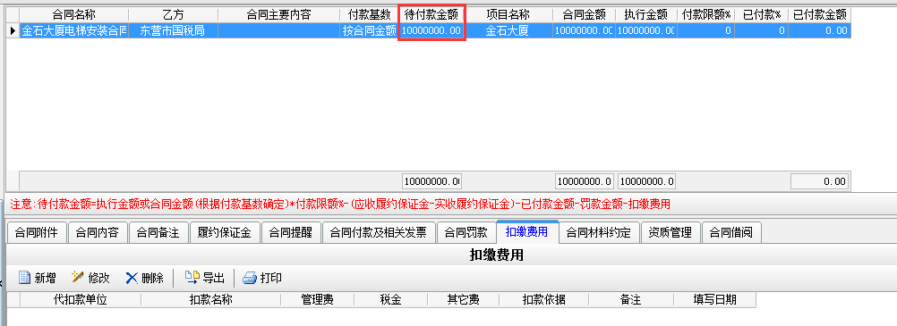 在工程項目資質(zhì)掛靠管理中乙方B借用乙方A的資質(zhì),乙方A需要扣除乙方B管理費,如果需要乙方A代開發(fā)票還需要扣除稅金。在分包合同中[扣繳費用]模塊下操作,如下圖: