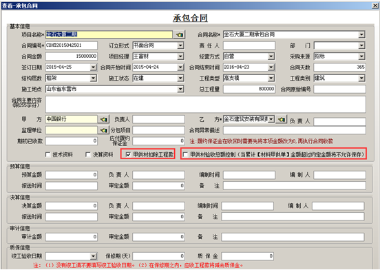 在編輯合同內(nèi)容時(shí)一定要注意填寫“合同金額”、“預(yù)算信息”里面的“預(yù)算金額”“審定金額”,“決算信息”里面的“結(jié)算金額”“審定金額”,如果有質(zhì)量保證金,則輸入“竣工日期”“保修期”以及“質(zhì)保金”金額。