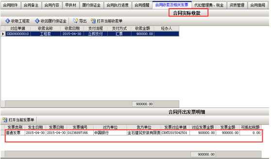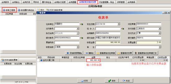 合同收款時(shí)點(diǎn)擊“合同收款及相關(guān)發(fā)票”,點(diǎn)擊“收取工程款”彈出收款單,填寫收款單詳細(xì)信息,輸入收款金額,如果有開發(fā)票需在“發(fā)票管理”添加發(fā)票信息并對(duì)應(yīng)好合同號(hào):