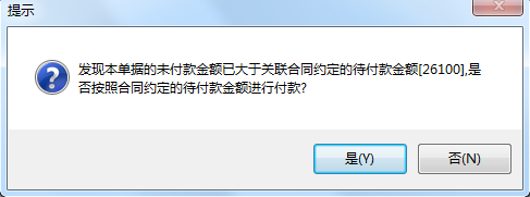 我們填寫的付款控制比例為20%,當(dāng)付款數(shù)超過付款比例限制時(shí),系統(tǒng)提醒。如下圖