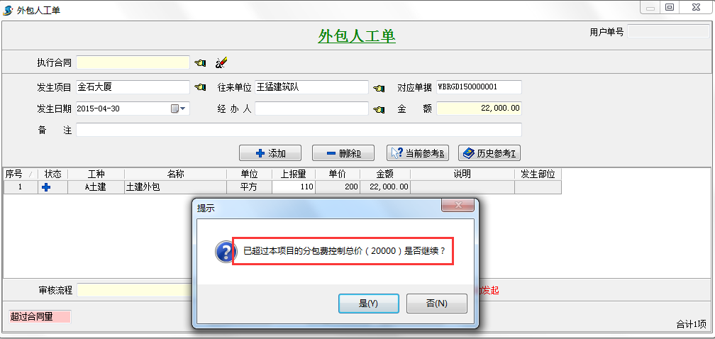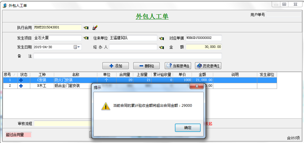當(dāng)我們驗(yàn)收超過總額時(shí)系統(tǒng)會(huì)自動(dòng)提示,并且外包人工單不能保存。