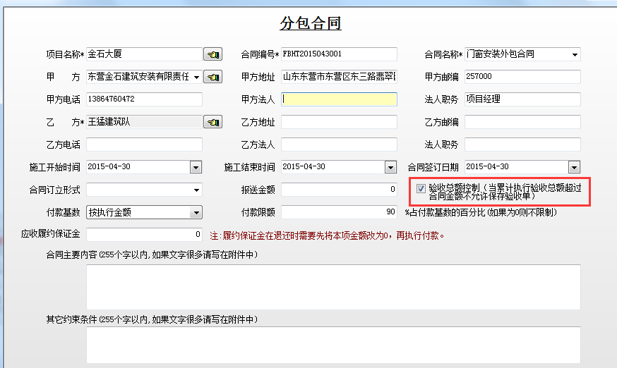 即通過分包合同驗(yàn)收總額控制選項(xiàng)來控制驗(yàn)收總額。