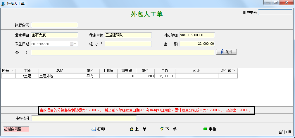 填入成本控制金額,當(dāng)超過該金額時(shí),系統(tǒng)會(huì)自動(dòng)提示。假如我們成本控制金額填入20000,我們?cè)谛落浫胪獍斯螘r(shí)會(huì)自動(dòng)提示。