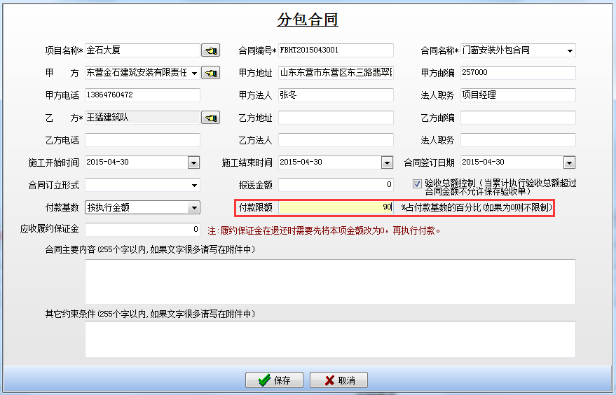 即在新建分包合同時(shí)填寫好付款限額。如下圖: