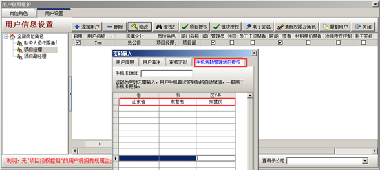 如果用戶有手機(jī)考勤管理地區(qū)授權(quán),則點(diǎn)擊“手機(jī)考勤管理地區(qū)授權(quán)”,輸入被授權(quán)的地址,則用戶會(huì)有權(quán)限查看被授權(quán)地區(qū)的員工考勤信息。