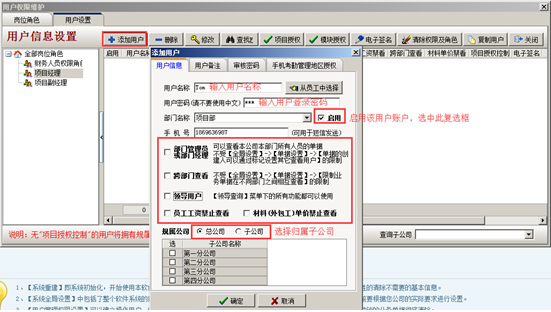輸入用戶名稱(可從員工中選擇),輸入用戶“登錄密碼”,選擇“部門名稱”,啟用該用戶則可勾選“啟用”的復(fù)選框,可按照用戶的崗位及權(quán)限選擇對應(yīng)的查看權(quán)限,選擇用戶歸屬子公司。
