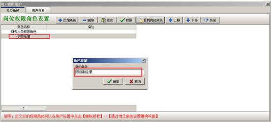 如果建立的新的崗位角色跟目前系統(tǒng)中現(xiàn)有的崗位角色擁有同樣的系統(tǒng)操作權(quán)限,可選中當(dāng)前崗位角色,點(diǎn)擊“復(fù)制崗位角色”的按鈕,復(fù)制完成之后,新的崗位角色跟當(dāng)前崗位角色擁有同樣的系統(tǒng)操作權(quán)限,如圖: