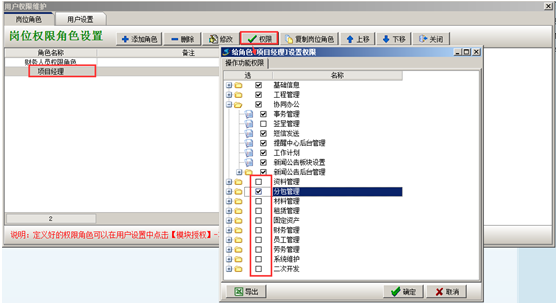 選中崗位角色名稱,點(diǎn)擊“權(quán)限”按鈕彈出“給崗位角色設(shè)置權(quán)限”的按鈕,在給崗位角色分配權(quán)限的功能模塊打鉤,設(shè)置完成后點(diǎn)擊“確定”按鈕,如圖: