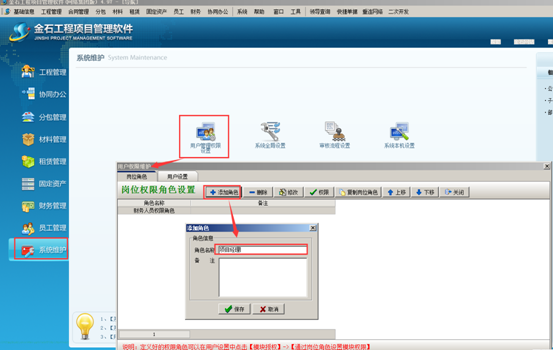 進(jìn)入系統(tǒng)的“系統(tǒng)維護(hù)”點(diǎn)擊“用戶管理權(quán)限設(shè)置”,彈出“用戶權(quán)限維護(hù)”的對話框,點(diǎn)擊“崗位角色”-“添加角色”彈出“添加角色”的對話框,在角色名稱的文本框里面輸入“角色名稱”點(diǎn)擊保存的按鈕,如圖:
