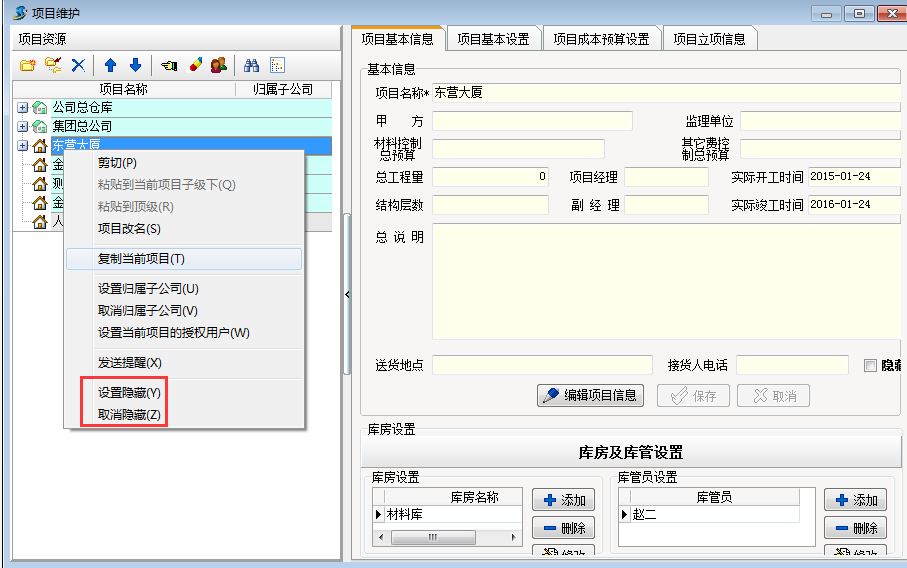 工程管理-項(xiàng)目維護(hù)-選中項(xiàng)目右鍵設(shè)置隱藏或者取消隱藏。 如下圖: