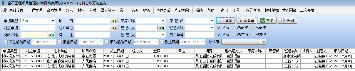 2.3.1設(shè)置項(xiàng)目隱藏前查詢時(shí)統(tǒng)計(jì)所有項(xiàng)目數(shù)據(jù),我們以材料總賬萬能查詢?yōu)槔?,如下圖