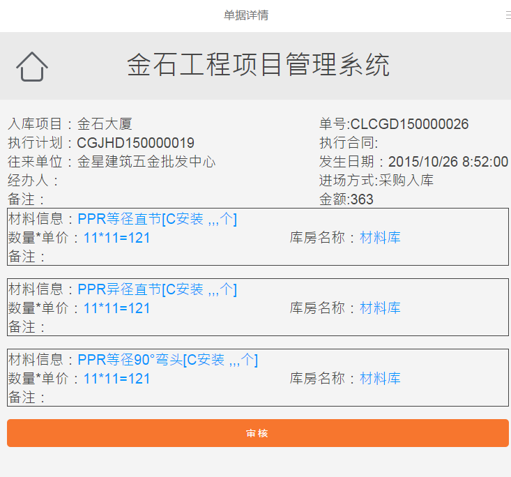 收到提醒信息后如果想審核該單據(jù)點(diǎn)擊“點(diǎn)擊審核”會(huì)自動(dòng)跳轉(zhuǎn)到金石軟件手機(jī)版版(支持PC瀏覽器)界面。如下圖: