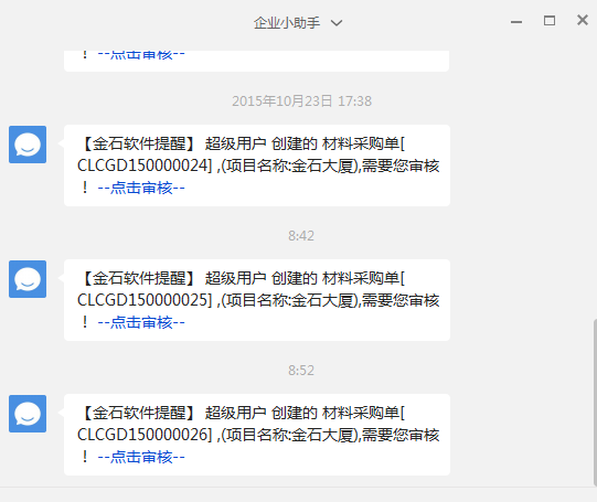 用超級(jí)用戶設(shè)置好微信認(rèn)證之后在,當(dāng)單據(jù)創(chuàng)建人發(fā)起審核后,審核過(guò)程中的人都會(huì)收到微信提醒信息。微信如下圖: