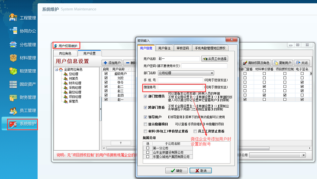 ⑶ 在金石軟件【系統(tǒng)維護】-【用戶管理權(quán)限設(shè)置】中設(shè)置每個使用用戶的微信賬號。如下圖: