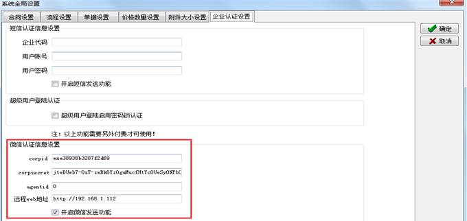 4. 獲取corpid, corpsecret和agentid好后登陸超級用戶在【系統(tǒng)維護】-【系統(tǒng)全局設(shè)置】-【企業(yè)認證設(shè)置】填寫微信認證信息。(此處需要開發(fā)商授權(quán))