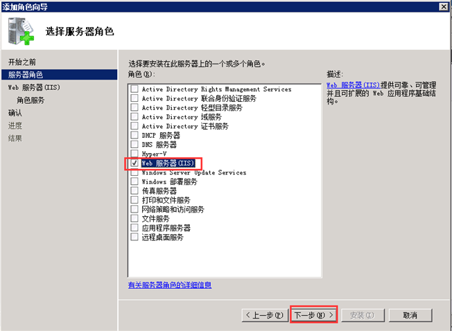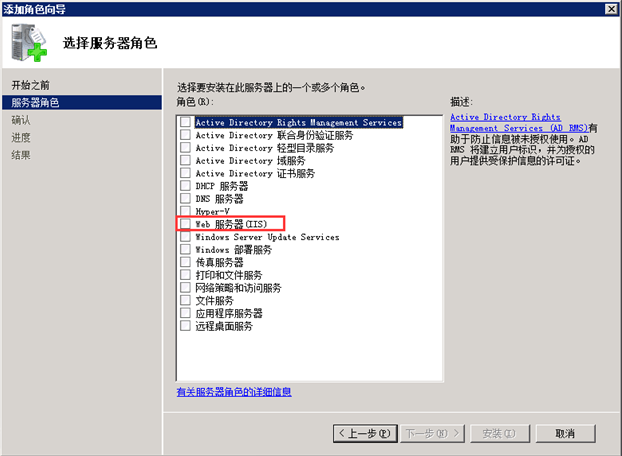 第二步,選擇服務(wù)器角色,在“Web服務(wù)器(IIS)”的復(fù)選框中打鉤。如圖: