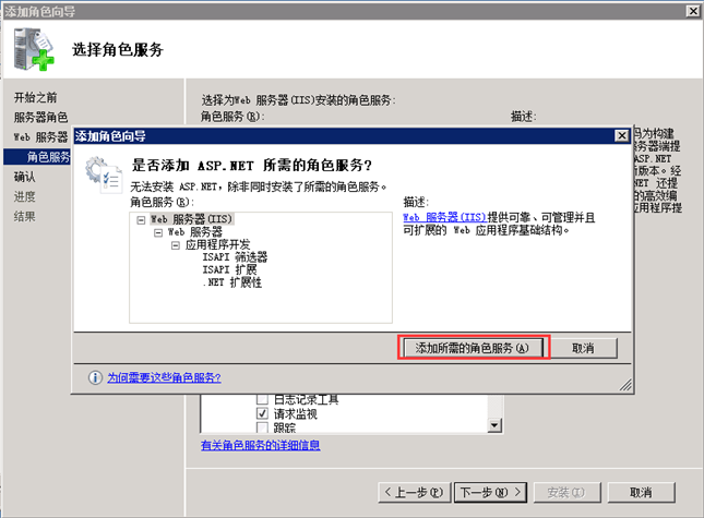 第三步,在彈出的對話框中,勾選“Asp.net服務(wù)”以及“Asp”服務(wù),點(diǎn)擊確定。如圖: