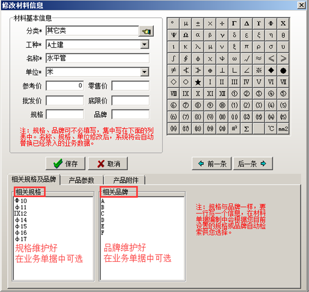 點擊“新增”或“修改”的按鈕來編輯材料信息,在進行材料基本信息編輯時,可進行相關規(guī)格以及相關品牌的維護,對應的規(guī)格及品牌維護完成在系統(tǒng)的業(yè)務單據(jù)中可選,這樣可避免同種材料在系統(tǒng)中生成多條記錄的麻煩。如圖: