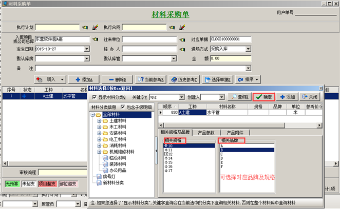 (1)、相關規(guī)格和品牌設置好后,在做材料相關單據(jù)時系統(tǒng)會自動列出以供選擇。