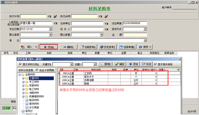 審核通過的“材料信息”可在系統(tǒng)業(yè)務單據(jù)中可用,如圖: