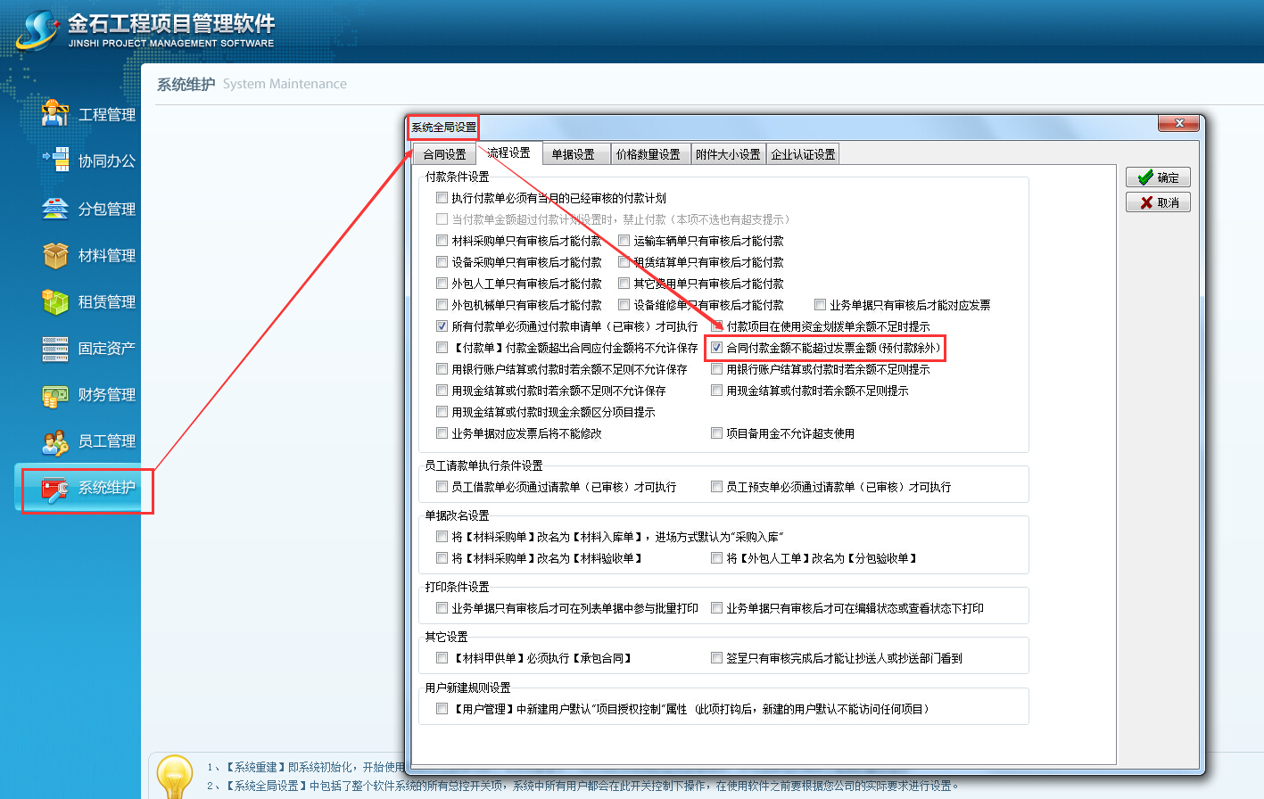 在【系統(tǒng)維護】-【系統(tǒng)全局設置】可以設置合同付款金額不能超過發(fā)票金額(預付款除外),如下圖: