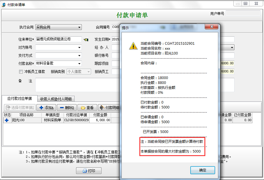 現(xiàn)在針對該采購合同進行付款,根據(jù)軟件控制,最大可付金額為發(fā)票金額5000,超過5000,軟件會有超付提示,并且并且付款申請單或者付款單不能保存。如下圖: