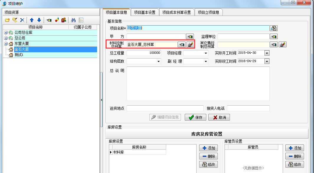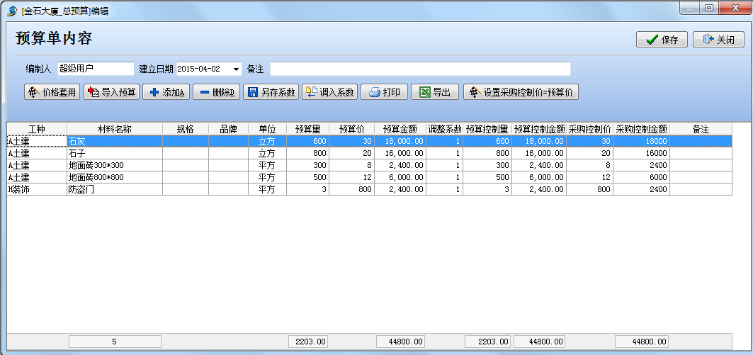 如圖在工程項目管理系統(tǒng)中建立一個金石大廈的材料預(yù)算單