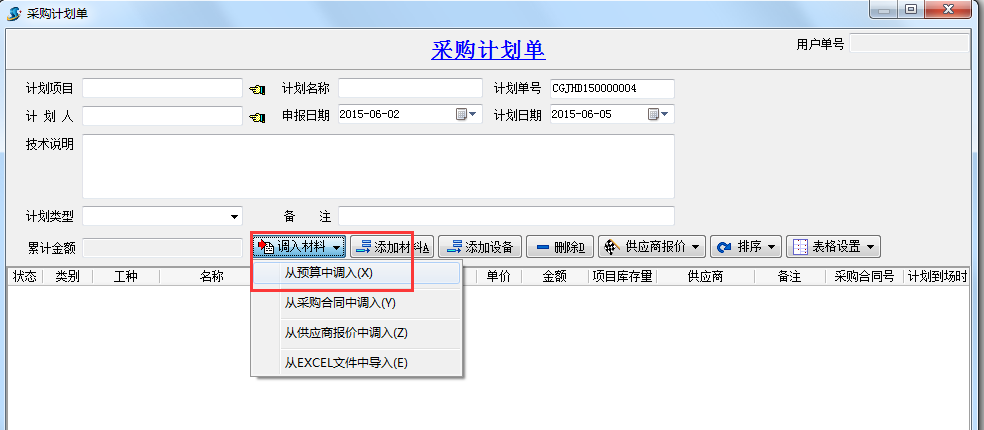 在工程項目管理系統(tǒng)中新建采購計劃單時,添加材料內(nèi)容選擇從預(yù)算中調(diào)入,如下圖