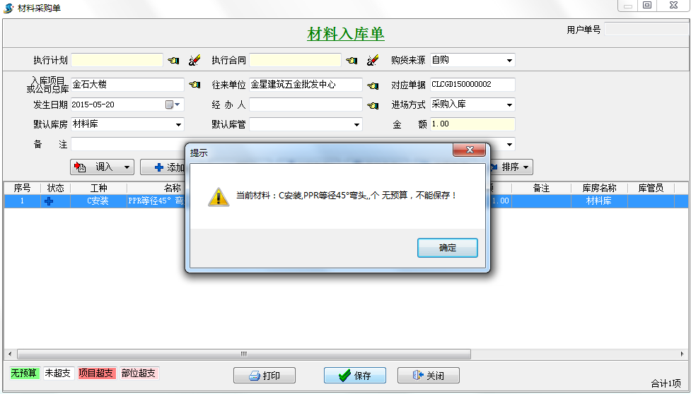 在填寫工程項目采購計劃單,材料入庫單,材料出庫單,材料調(diào)撥單時都會根據(jù)預(yù)算單來進(jìn)行相應(yīng)的顏色提示。