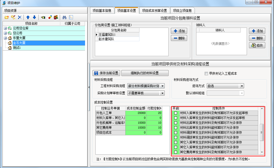 在工程項目管理系統(tǒng)中選好控制條件在開啟處打上勾。例如我們選定材料入庫單發(fā)生的材料沒有預(yù)算不能允許保存。